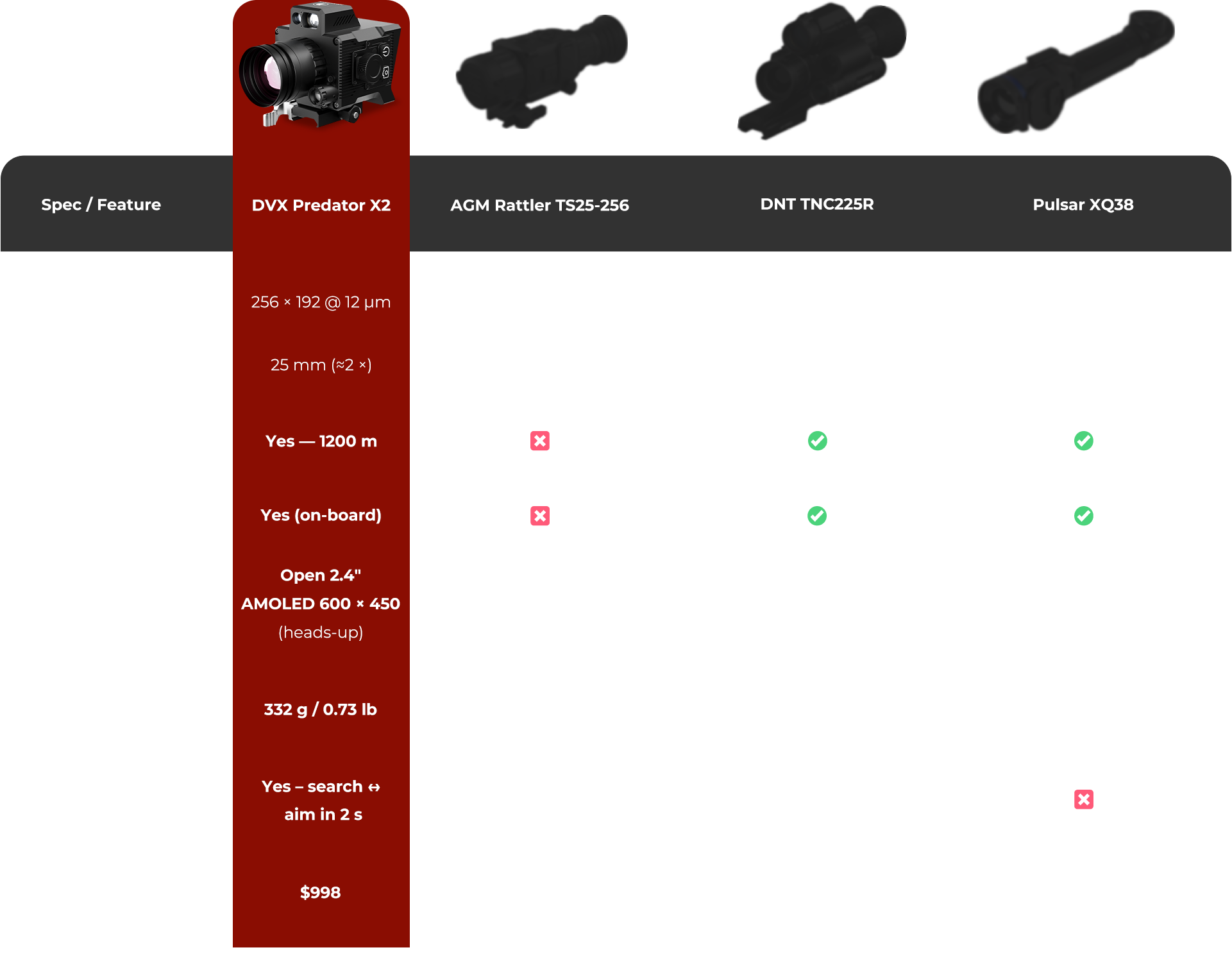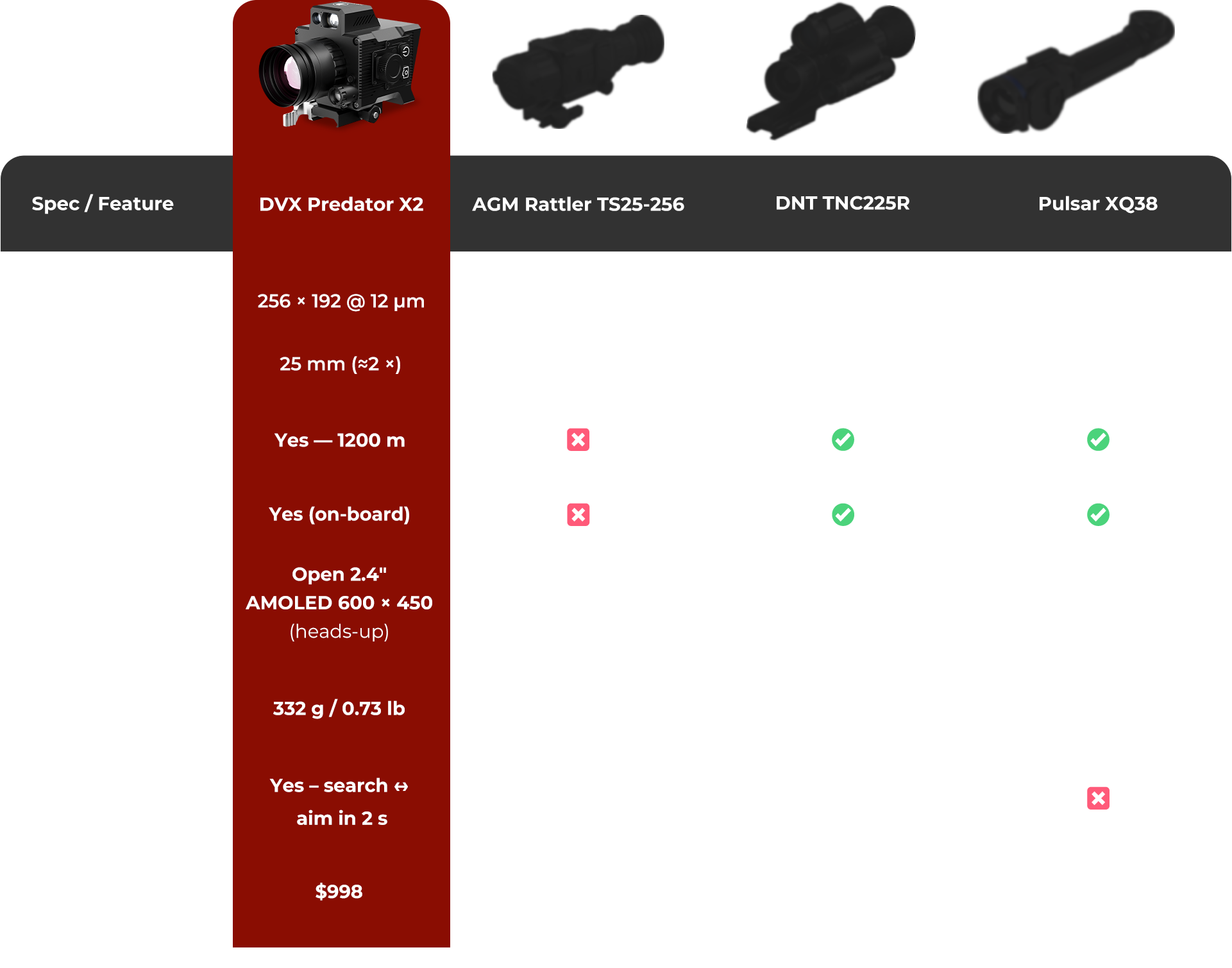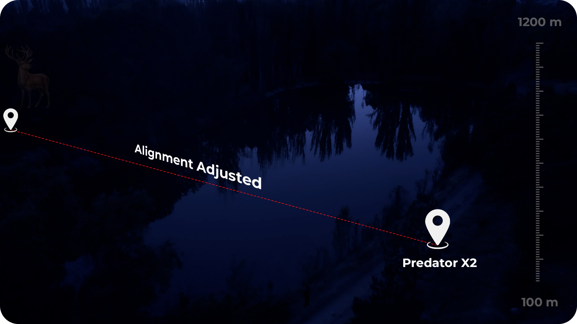 Predator X2’s 1,200 m laser rangefinder spots your mark in an instant. The invisible pointer tags it for you — silently, without a trace — so you can move, aim, and act with absolute confidence.