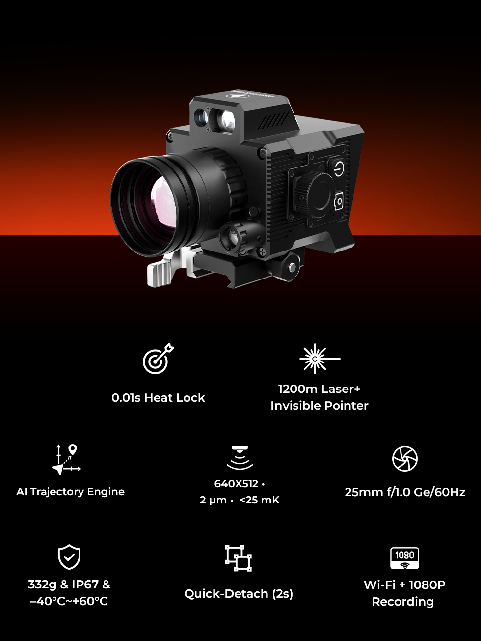0.01 s heat lock • 1,200 m laser range-finder (invisible pointer) • Real-time AI trajectory