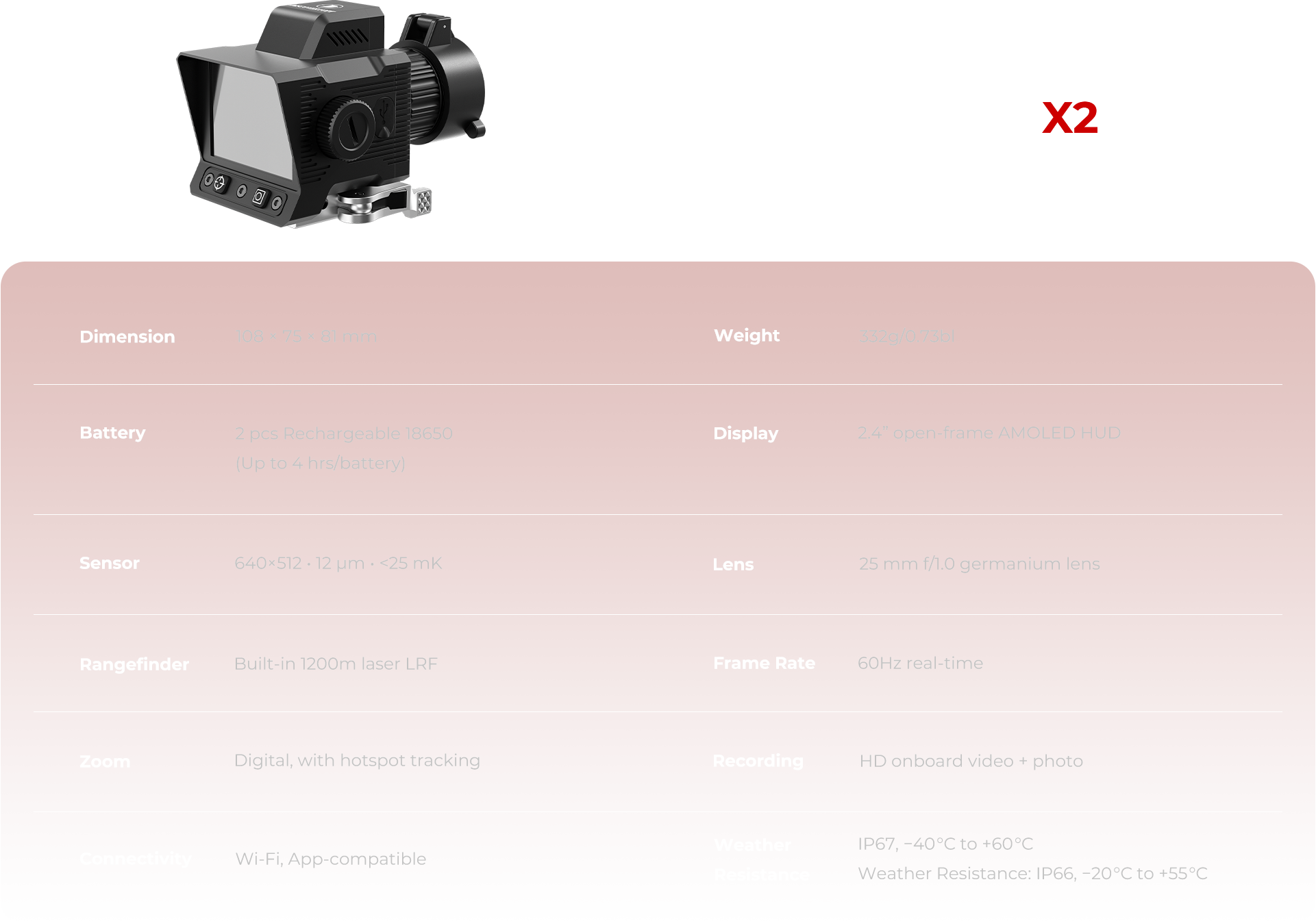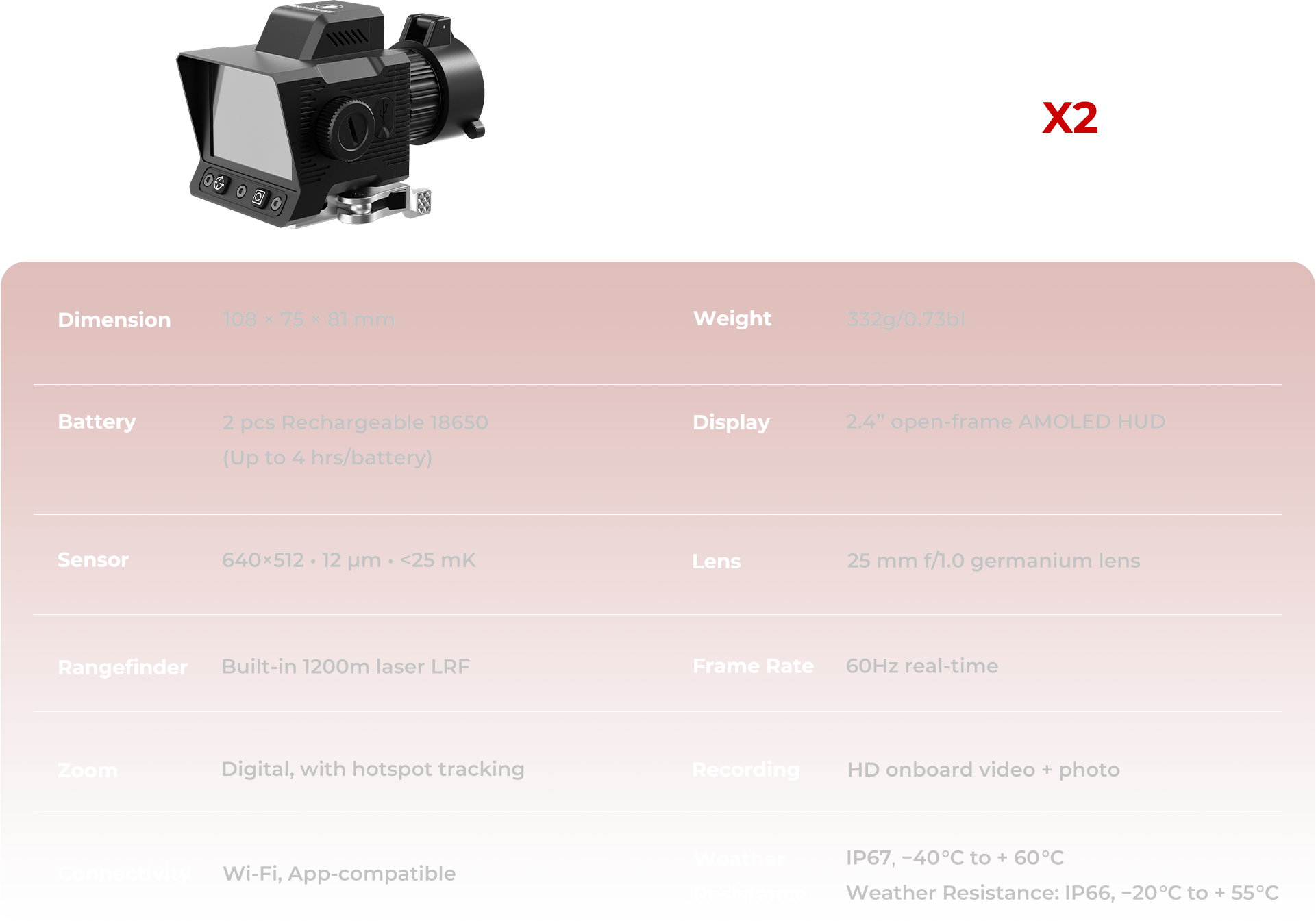 With Picture-in-Picture, Predator X2 delivers a close-up thermal window inside your main view — helping you scan wide, zoom fast, and strike with precision. Switch between 4 palettes to adapt to any terrain or condition.